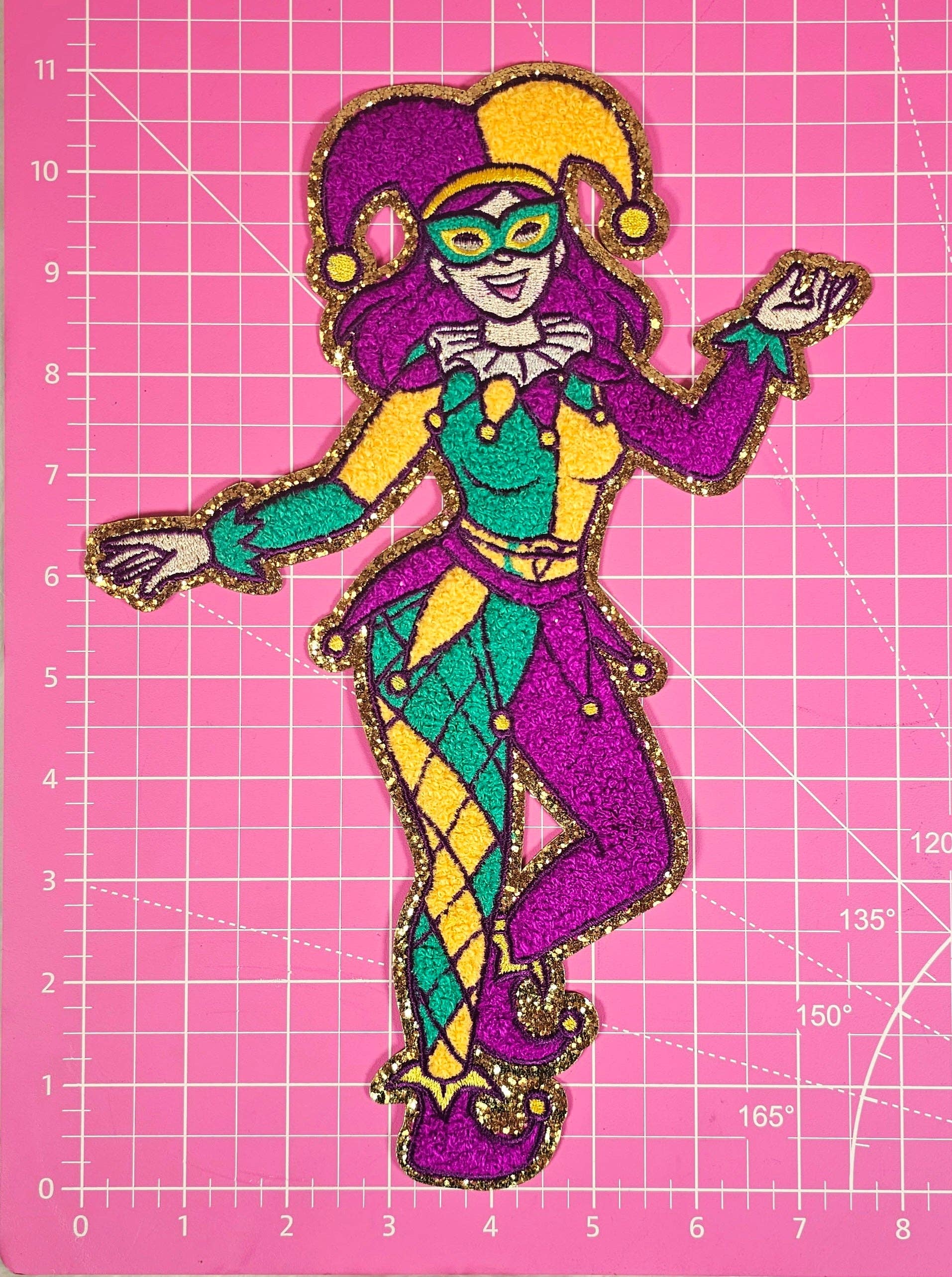 Dancing Mardi Gras Joker Chenille Glitter Large Iron On Patch