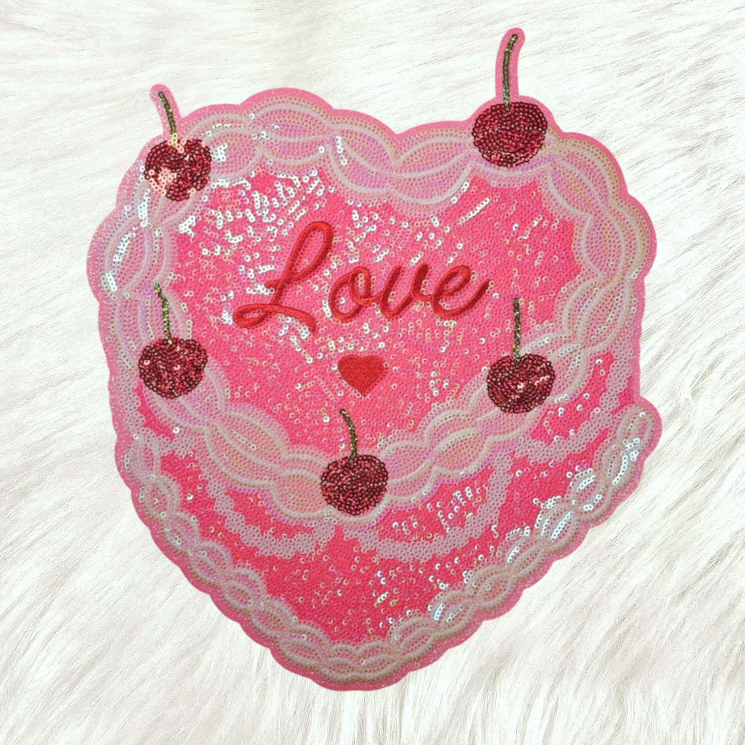 Love Cake Sequin Cherry Pink Glitter Large Iron On Patch