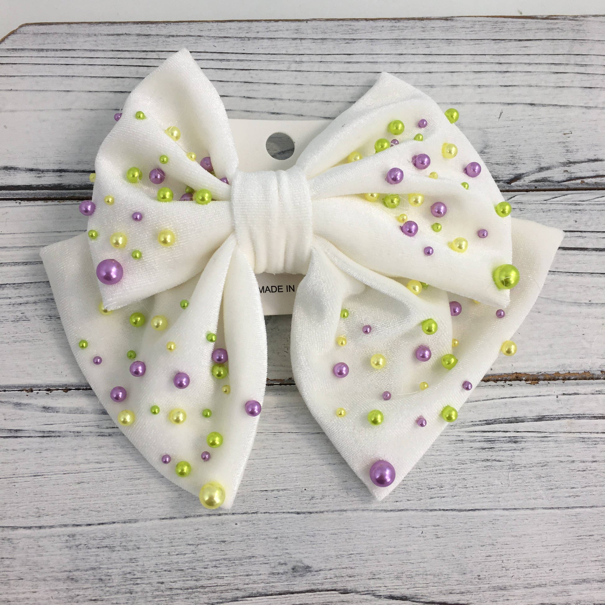 These are our gorgeous velvet Mardi Gras Pearl hair bows! These are so beautiful and festive and perfect for the Mardi Gras season! These are 5 inches wide and have a french barrette clip. This item comes in white and purple. Find more in our Mardi Gras accessories collection!